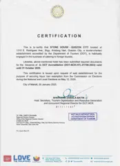 Stone House – Quezon City is a Department of Tourism (DOT)–accredited tourist-oriented establishment, authorized to cater to both local and foreign guests. Our DOT Accreditation (DOT-NCR-HTL-01706-2022) is valid until 31 October 2026, ensuring compliance with national standards for safety, quality, and service excellence.